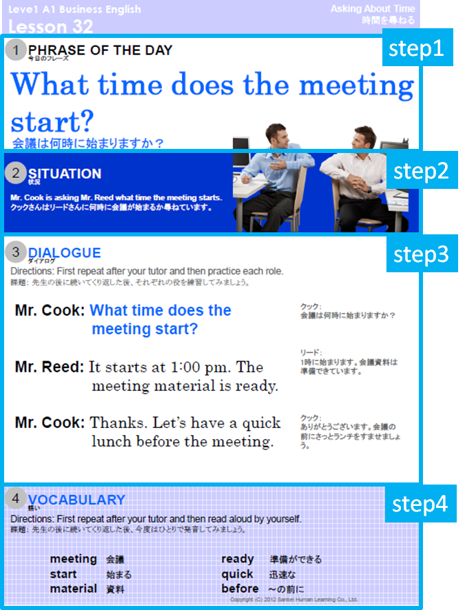 参考までに私が1200時間受講した産経オンライン英会話Plusのレベル1ビジネス初級テキストをご紹介しますね。